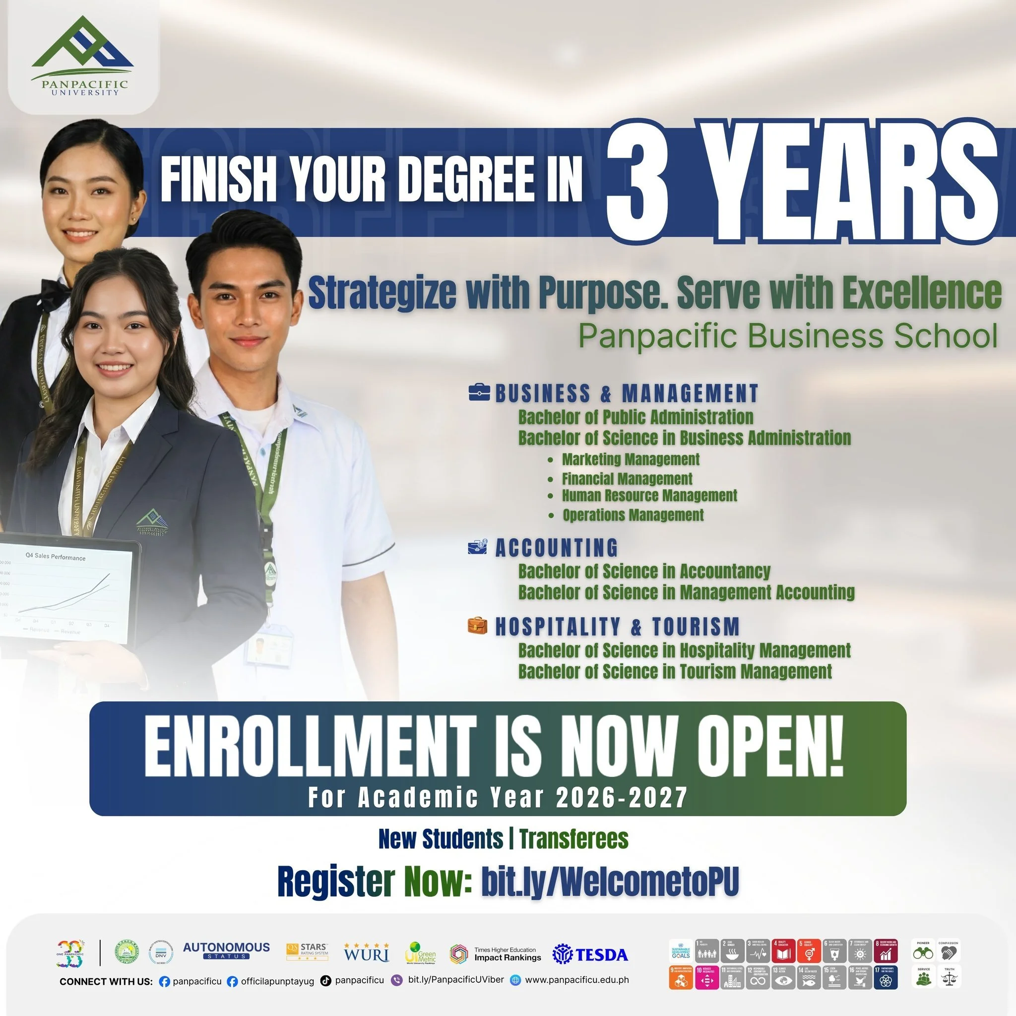 Choose a smarter path to professional success. Our accelerated programs in Business, Accounting, and Hospitality & Tourism combine rigorous industry knowledge with hands-on leadership training getting you degree-qualified and career-ready in just three years.